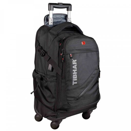Passend zur Tibhar Tasche Shanghai bringt der deutsche Hersteller nun den farblich passenden Rucksack Trolley auf den Markt. Dieser bietet ausreichend Stauraum im inneren und ist mit Rollen und einem ausziehbaren Teleskopgriff ausgesttatet. Besonders hervorheben sollte man das integrierte und gepolsterte Notebook Fach sowie der integrierte USB Anschluss mit dem sich Handys oder auch weitere Produkte aufladen lassen. Durch die Rollen ist ein schweres Tragen nicht mehr von Nöten. Der Rucksack ist qualitativ hochwertig verarbeitet und vom Design her sehr schlicht und modern gehalten.